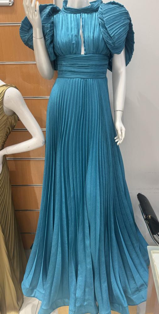 فستان تركي راقي طويل بأكمام مميزه بشكل كلوش قماش من التفته الفاخر دبل كلوش بتصميم من الصدر والخصر بشكل كمر كسرات