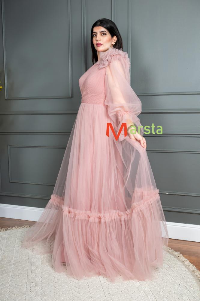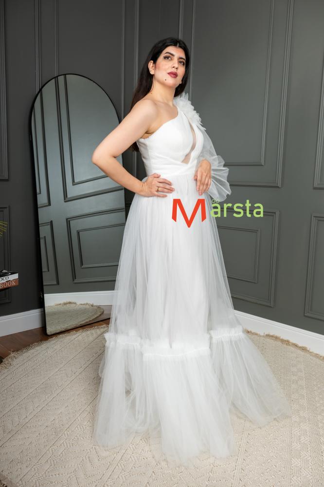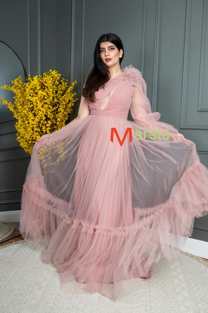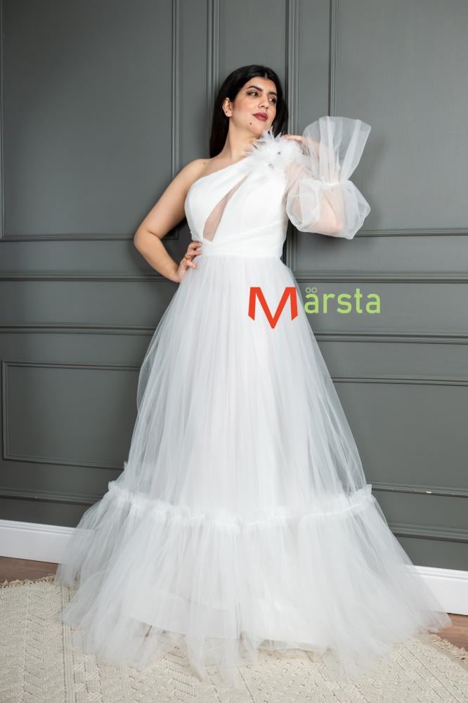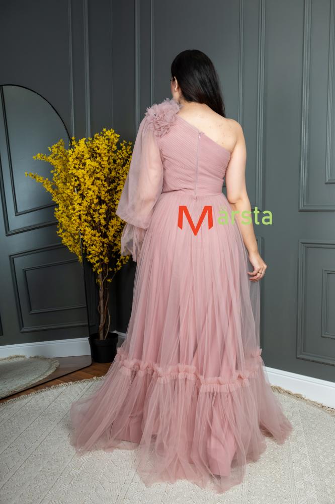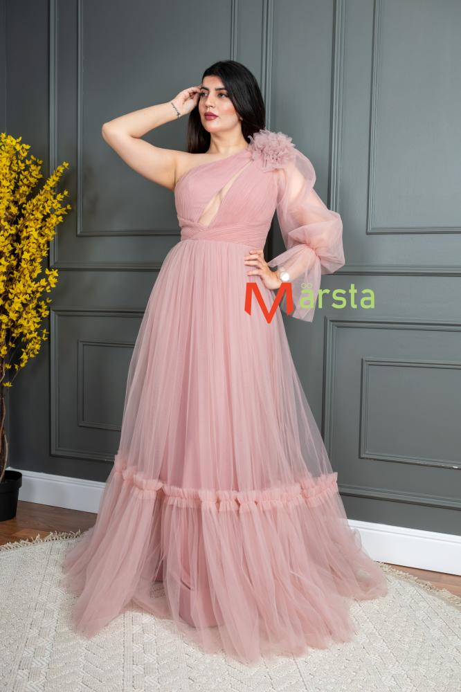 فستان تركي سهره تل دبل كلوش بقصة كم واحد وكرانيش على الكتف