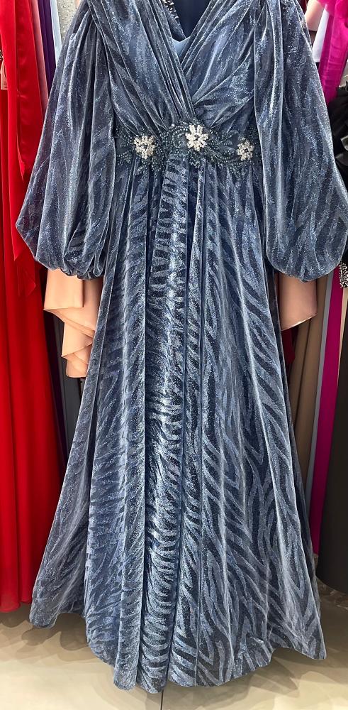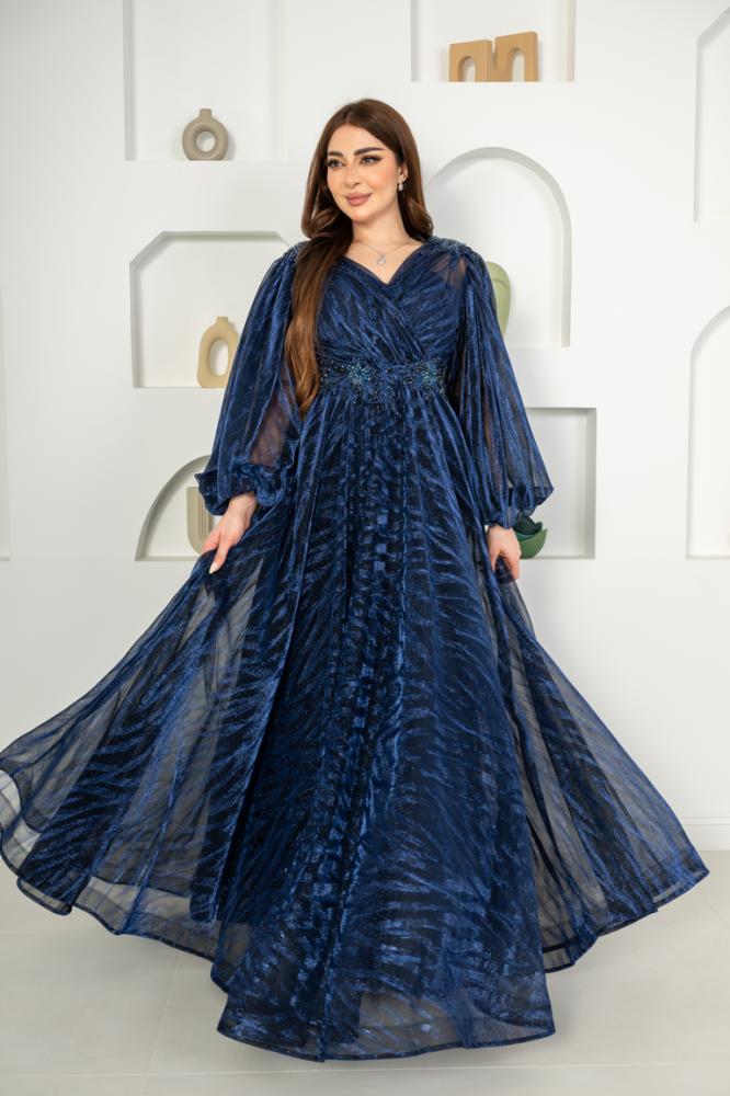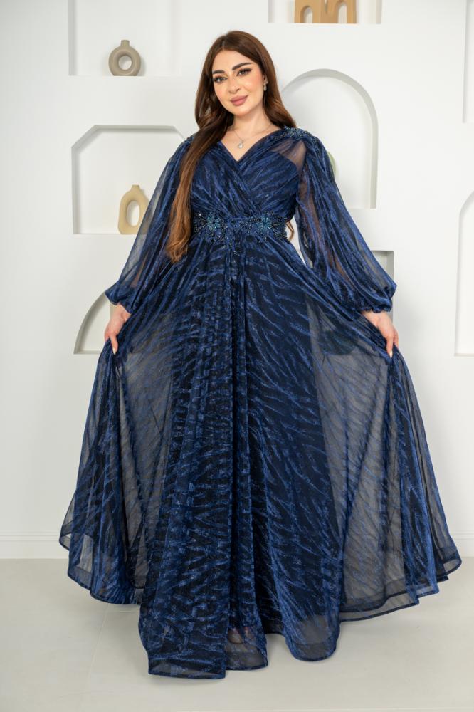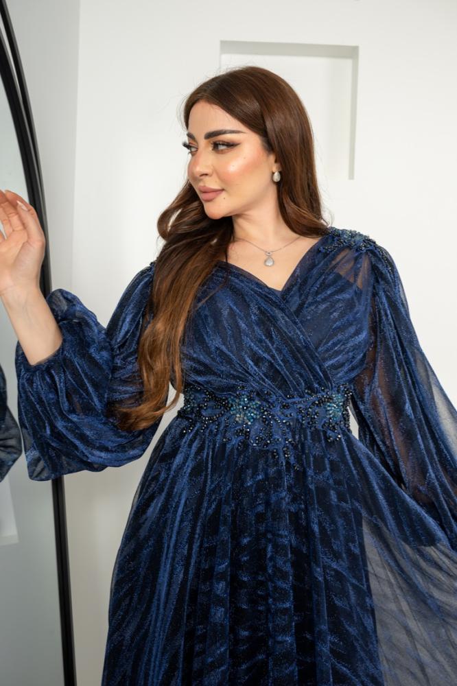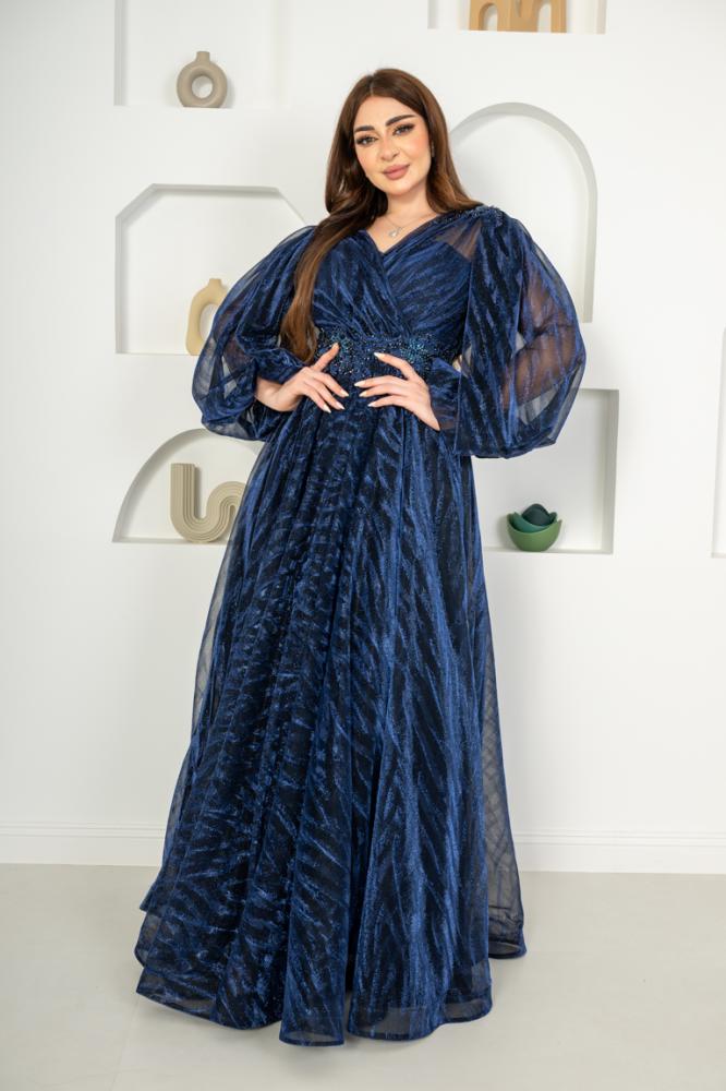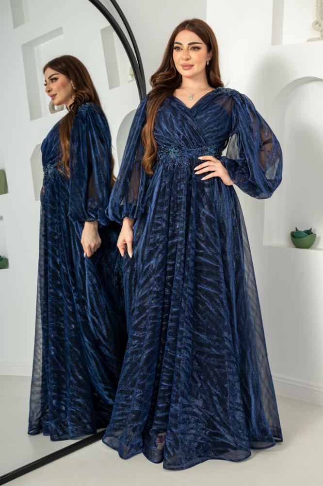 فستان تركي راقي بقصة أكمام بالونه وتطريز على الخصر والأكتاف دبل كلوش
