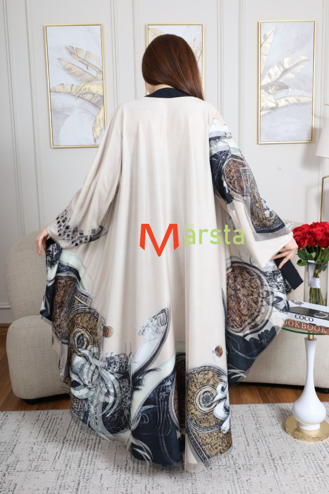 بشت نسائ شبابي تركي بطباعة ديجتال حسب الموضح في الصور يتميز نوع القماش للطبقه الخارجيه بنعومة الملمس حيث نوعية القماش من الثل الناعم مطبوع بطباعة مماثله للطبقه الداخليه نوع قماش الطبقه الداخليه لبانه ناعم بلمعه وطباعة برنت متناسق ومماثل للطبقه الخارجيه يلبس كبشت على الفساتين الماسكه كعباءة وايضاً على البناطيل والتيشيرتات الشبابيه يعطي منضر جذاب ومختلف وملفت