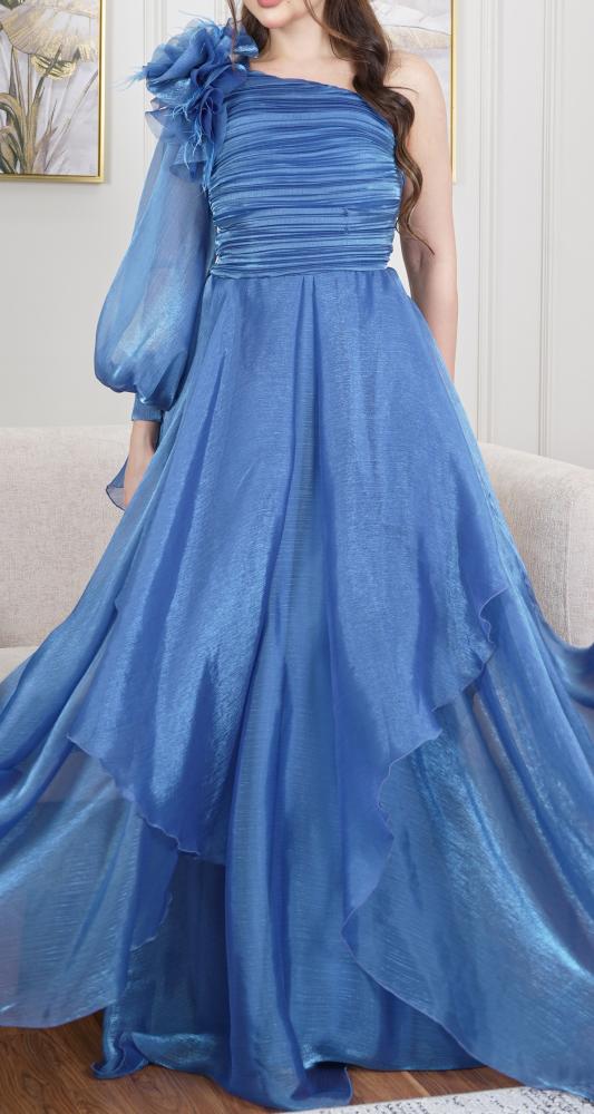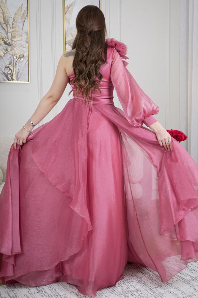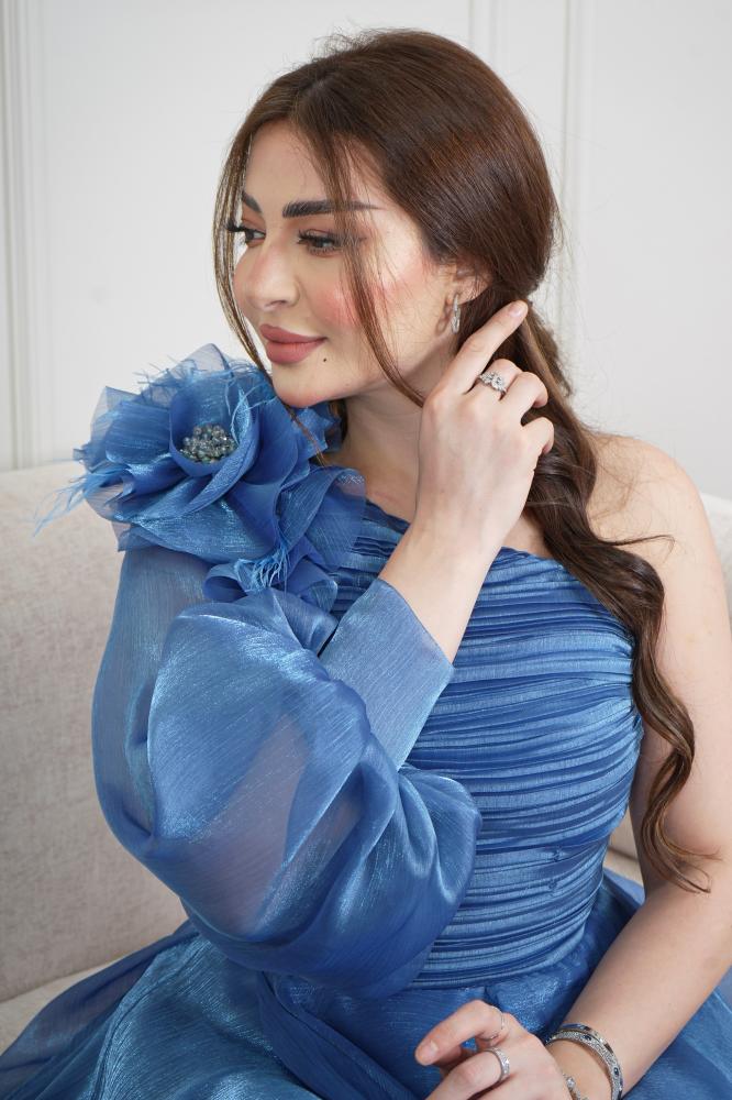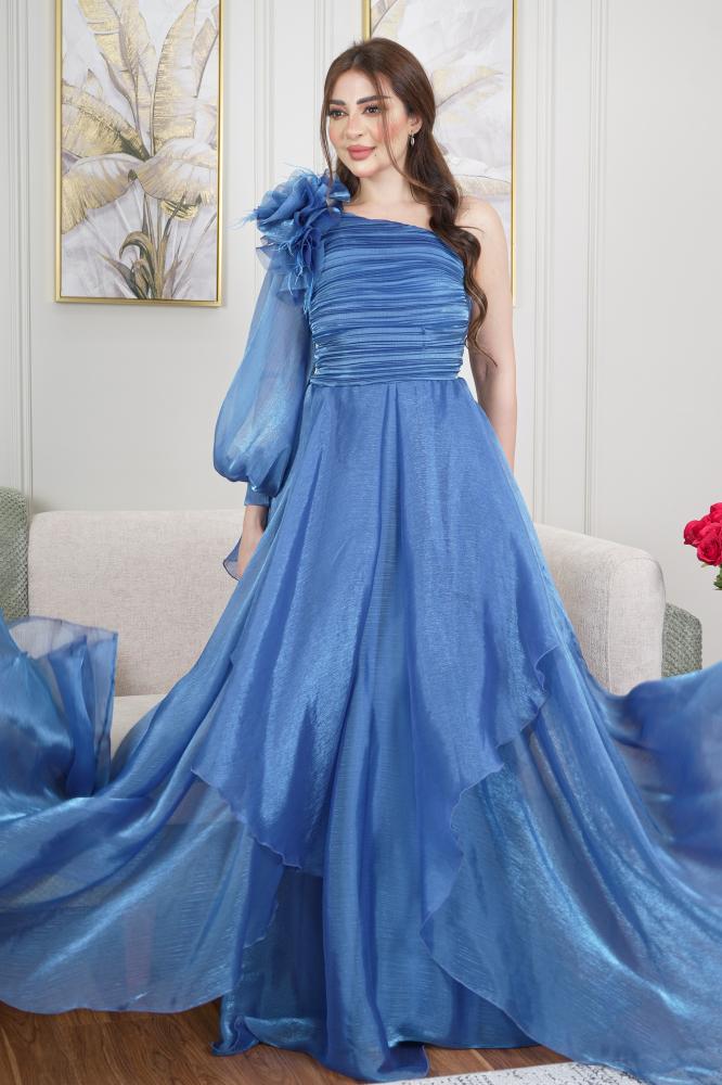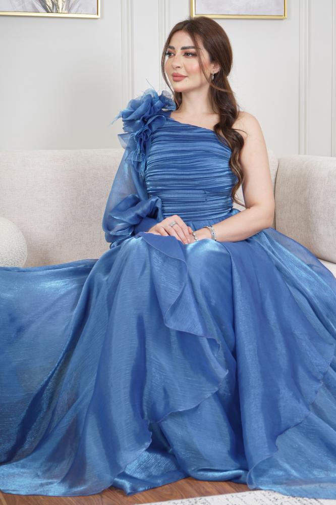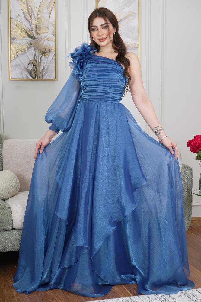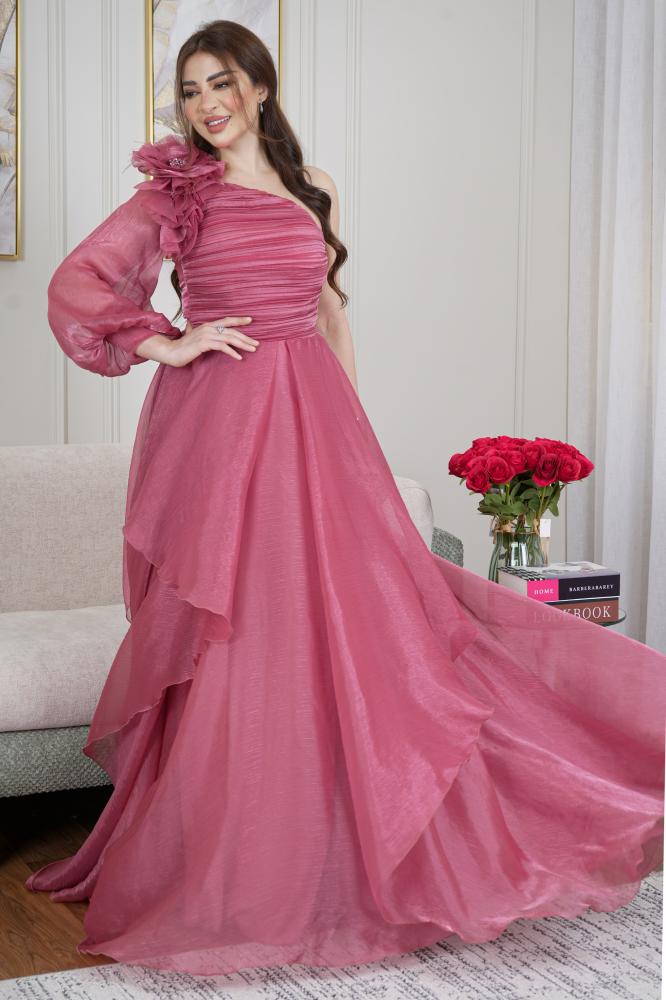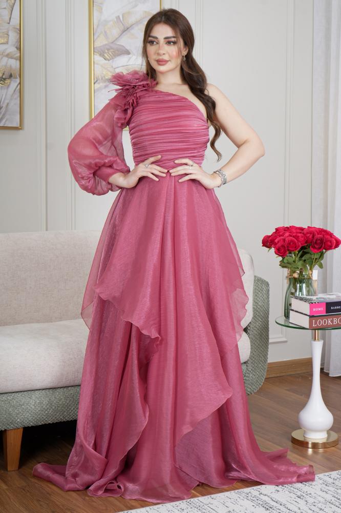 فستان تركي بقصة كتف واحد بورود دبل كلوش من القماش الناعم اورجنزا حرير