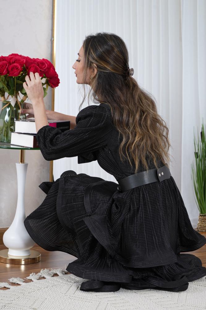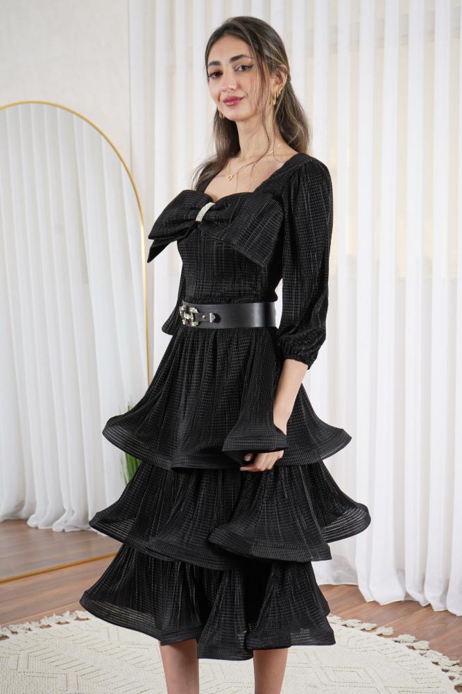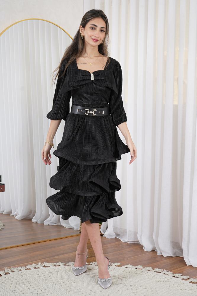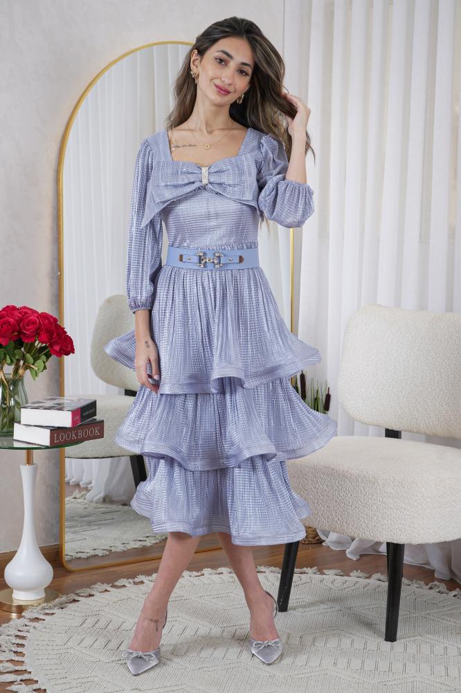 فستان تركي ميد كرانيش طبقات بحزام مميز بقصة كرفته على الصدر نوع القماش مقلم مخفي جمنتكس